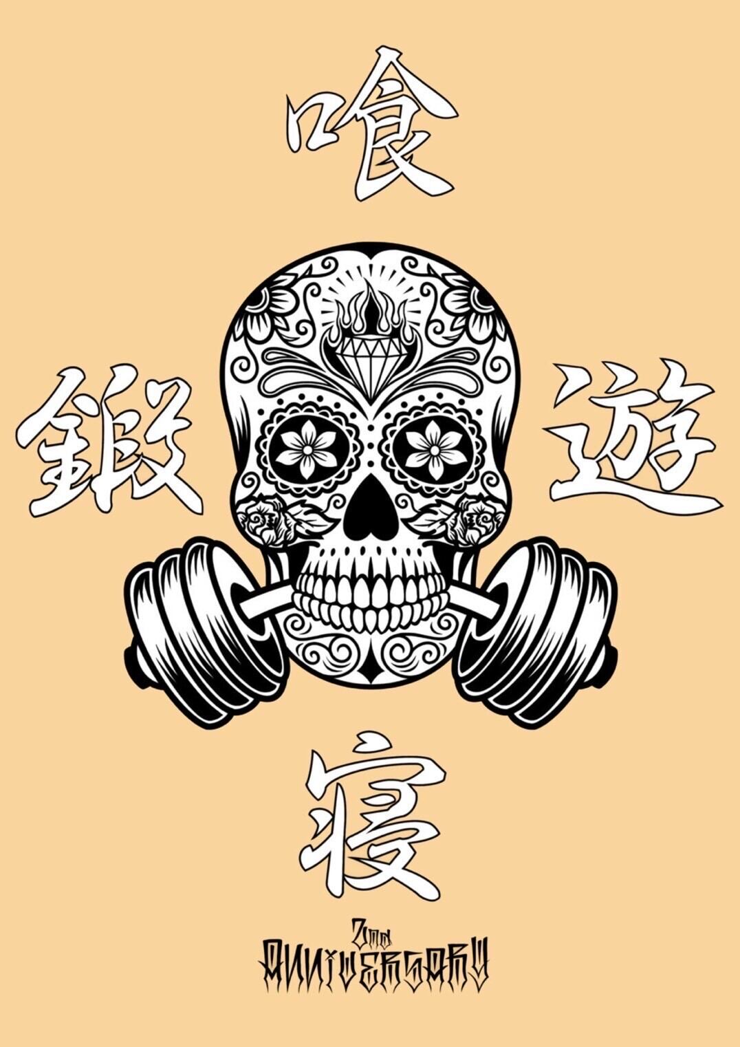 中央にダンベルを噛んだカラベラ(ガイコツ)をIN。