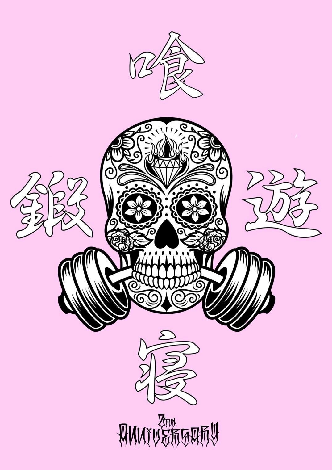 中央にダンベルを噛んだカラベラ(ガイコツ)をIN。